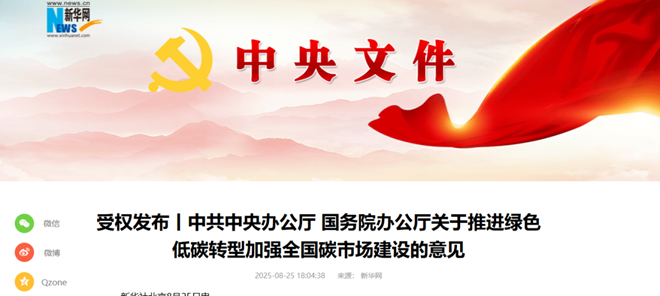 8月25日,新华网发布《受权发布丨中共中央办公厅 国务院办公厅关于推进绿色低碳转型加强全国碳市场建设的意见》。